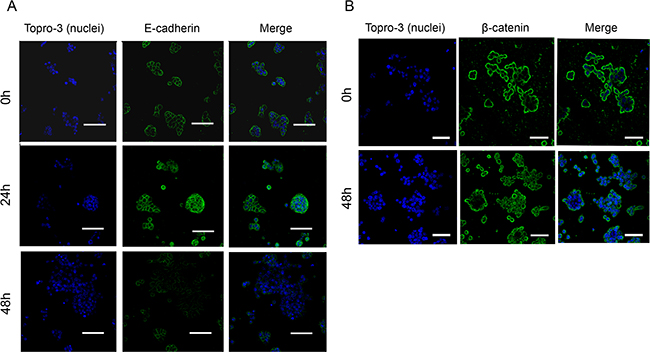 Cells were set up 5x104 cells per well of a 4-well Nunc™ Lab-Tek™ II Chamber Slide™ System (Thermoscientific, Waltham, MA) and treated for 24h and 48h with JWH-133 0.1 μM, when necessary. After treatment, cells were fixed with Methanol for 10 minutes, washed with PBS, incubated in 50 mM NH4Cl and blocked with 5% BSA to reduce non-specific protein binding. Cells were incubated with Anti E-Cadherin (1/25) or Anti β-catenin (ready-to-use) overnight at 4ºC, washed with PBS and followed with Alexa Fluor 488 anti-mouse (Invitrogen Life Technologies, 1/1000) for 45 minutes at room temperature. Nuclei were stained with Topro-3 (Invitrogen Life Technologies, 1/500) for 20 minutes. The chambers were removed from the glass slide and cells were visualized with inverted Microscopy. Images of the specimens were collected with a TCS SP5 confocal microscope (Leica Microsystems, Wetzlar, Germany), equipped with 10×0.22 and at an optical zoom of 3. Z-series images were obtained through the collection of serial, confocal sections at 1 μm intervals.