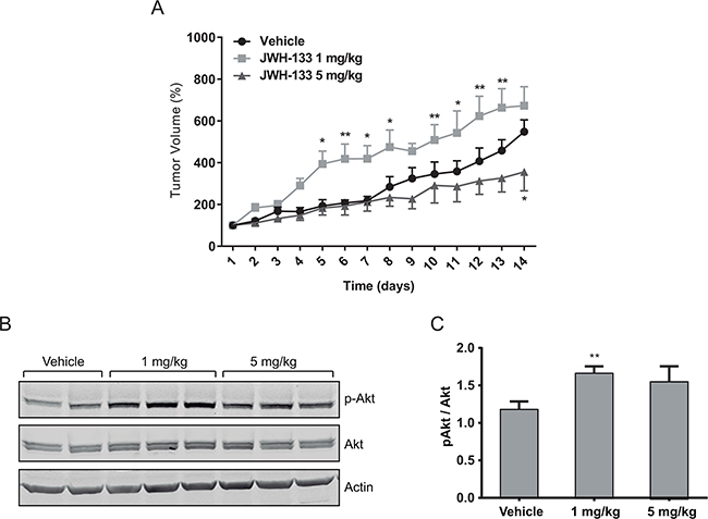 In agreement to our in vitro results, we observed significant higher p-AKT levels in the 1 mg/kg-treated group respect to the vehicle- or 5 mg/kg-treated groups (Figure 6B). However, in the 5 mg/kg-treated group p-AKT levels are higher (although not significant) than in the vehicle-treated one, which could be because the bioavailability of JWH-133 may vary in different areas of the tumor, leading to intra-tumoral variability of the effect.