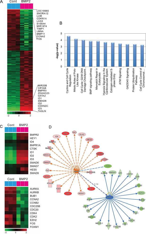 Figure 3: Gene expression profile regarding the effect of rhBMP-2 in SNU484 gastric cancer cells. A. A microarray heat map summarizing the effect of rhBMP-2 using an Illumina bead array platform. Data are presented in a matrix format. Rows represent the individual genes and the columns represent samples. Red, up-regulation; green, down-regulation. B. Top canonical pathway analysis for different functional categories. C. Microarray heat map summarizing BMP signaling-related genes by rhBMP-2 treatment (top) and cell cycle regulation signaling-related genes by rhBMP-2 treatment (down). Potential targets of BMP-2 and c-Myc. D. Gene networks of BMP-2 and c-Myc from an Ingenuity TM pathway analysis. Red, up-regulation; green, down-regulation; blue, predicted inhibition; orange, predicted activation. Orange dash line, leads to activation; blue line, leads to inhibition.