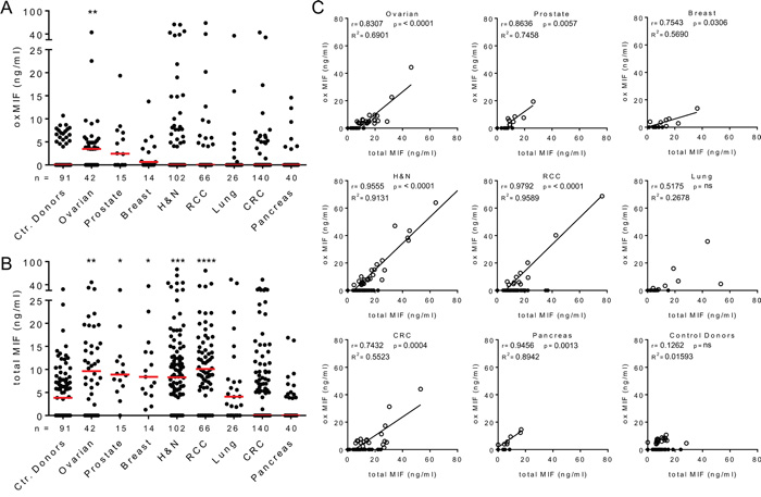 As expected, a baseline level of total MIF was detected in the same plasma samples from control donors (median 3.8 ng/ml), which is consistent with the MIF levels published in the literature [43, 44]. Significantly increased levels of MIF were detected in plasma from patients with ovarian cancer (median 9.6 ng/ml), prostate cancer (median 8.9 ng/ml), breast cancer (median 8.4 ng/ml), head and neck cancer (median 8.3 ng/ml) and renal cell carcinoma (median 10.1 ng/ml) (Figure 1B). Total MIF levels of patients with lung cancer, colorectal carcinoma and pancreatic cancer did not differ significantly from those of healthy controls. Correlation plots demonstrated that plasma levels of oxMIF and total MIF correlated in oxMIF positive patients, whereas no correlation was seen in healthy controls (Figure 1C). When oxMIF was detectable, this isoform comprised approximately 55-95% of MIF in the circulation of patients, which is comparable to the ratio found in patients with inflammatory diseases [40].