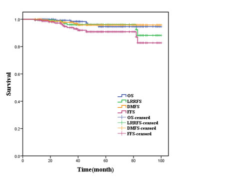 The survival time was calculated from the date of treatment; and the overall survival (OS), locoregional relapse-free survival (LRRFS), distant metastasis-free survival (DMFS), as well as failure-free survival (FFS) were treated as the endpoints, among which OS, LRRFS and DMFS referred to the duration from the date of treatment to the date of death, nasopharyngeal or locoregional lymph node relapse, and distant metastasis, respectively; while FFS was the duration from the date of treatment to the date of relapse, metastasis or death due to any cause. The Common Terminology Criteria for Adverse Events (CTCAE, v4.0) [21] was applied in observing treatment-associated toxicity reactions, and the indicators for further observation included: bone marrow suppression, liver and renal dysfunction, gastrointestinal reactions and weight loss.