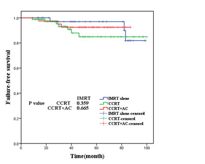 A large number of studies indicated that the main mode of treatment failure in NPC at the present stage was distant metastasis [22-25], and improving the local control rate was one of the objectives of comprehensive treatments of chemoradiotherapy. Since the 0099 experiment in America reports that the regimen of CCRT combined with AC can improve the OS and the PFS for patients with locally advanced NPC [26], the regimen has been gradually considered to be the standard treatment protocol for locally advanced NPC. At present, the NCCN guide recommends CCRT with/without AC for patients with stage II to IVb NPC. Xiao et al [23] showed in their research that T2, N1 were the high risk factors of distant metastasis for patients with early stage NPC, and the co-existence of the two factors resulted in the distinctly decreased DMFS in T2N1M0 patients than in T1-2N0M0 and T1N1M0 patients (P<0.05). Several previous studies reported the positive role of CCRT in treating patients with stage II NPC [8-10]. Though this seemed to illustrate that it was reasonable to apply CCRT in stage II nasopharyngeal carcinoma or its subgroups, it was undeniable that the treatment approaches that all cases in the above-mentioned studies received were conventional radiotherapy. Is there still a need to combine chemotherapy in treating stage II NPC in the era of IMRT?