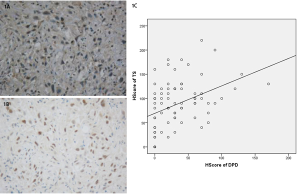 Figure 1: A. Immunohistochemical staining of DPD in colorectal cancer tissue. B. Immunohistochemical staining of TS in colorectal cancer tissue. C. Correlation between TS and DPD level.