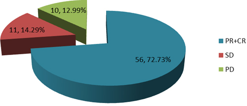 Therapeutic outcome was defined as CR: complete remission, PR: partial remission, SD: stable disease and PD: progressive disease. The therapeutic efficacy (PR+CR/total patients) in this study was 72.73% (Figure 2). The AUC in the PR+CR group was higher than in the SD and PD group (P < 0.05, Table 2). These results indicated that the AUC is positively correlated with therapeutic efficacy.