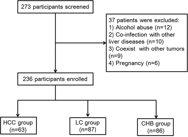 Figure 1 displayed the flowchart for the inclusion of all the patients in this cross sectional study. From September 2013 to November 2014, a total of 273 patients with HBsAg positive were screened at the department of Hepatology, Qilu Hospital of Shandong University. Of whom, a total of 37 patients were excluded as the following reasons: 12 for severe alcohol abuse, 10 for co-infection with other liver diseases, 9 for coexist with other tumors, 6 for pregnancy. Finally, a total of 236 patients were enrolled in this study. In addition, 30 healthy volunteers were collected as controls. The basic characteristic of all the subjects were presented in Table 1.