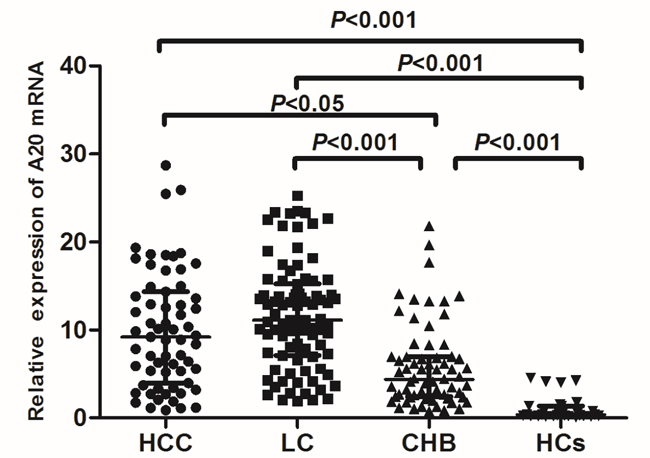 The present study demonstrated the dynamic change of A20 mRNA in different stages of chronic HBV infection. The median levels of A20 mRNA in all chronic HBV infected patients were significantly higher than healthy controls, whereas HCC and LC patients displayed increased levels of A20 mRNA than that in CHB patients. Although it was elevated at the stage of chronic HBV infection and even aggressive stages, A20 gene in PBMCs did not present continuous elevation along with disease progression from liver cirrhosis to hepatocellular carcinoma. This data suggested that A20 gene might not be the only regulator for the whole course of disease development.