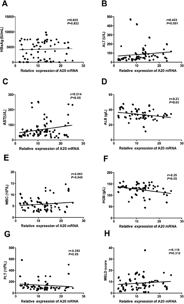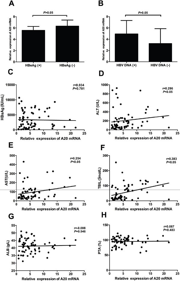 In this study, we performed quantitative real time-polymerase chain reaction (RT-qPCR) to determine the mRNA expression of A20 in peripheral blood mononuclear cells (PBMCs) from a cross sectional cohort and to explore the potential associations of A20 gene with clinical parameters in different stages of chronic HBV infection.