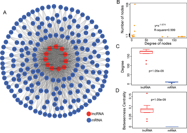 Figure 1: Construction and analysis of MI-related dysregulated lncRNA-mRNA co-expression network. A. The DLMCEN generated by the procedure described in the Methods, including 1822 edges between 188 mRNAs and 11 lncRNAs. B. Degree distribution of the DLMCEN. C. The LncRNAs have significantly higher degrees than mRNAs in the DLMCEN. D. The lncRNAs have significantly higher betweenness centrality than mRNAs the DLMCEN.