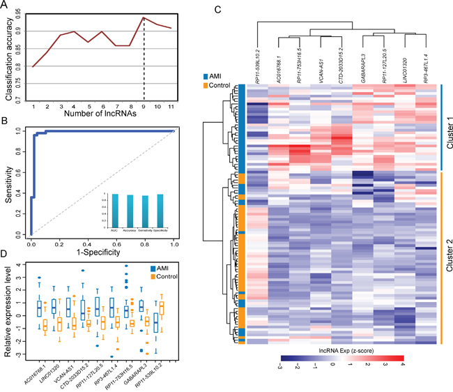 Figure 2: Identification and predictive value of SVM-based lncRNA signature in AMI diagnosis from the discovery cohort. A. Classification performance of different numbers of lncRNA biomarkers. B. Performance evaluation of the 9LncSigAMI in early diagnosis using LOOCV procedure in the discovery cohort. C. The hierarchical clustering heat map of 99 samples based on expression profiles of 9 lncRNAs in the 9LncSigAMI in the discovery dataset. D. The expression levels of 9 lncRNAs in the 9LncSigAMI between MI patients and healthy samples