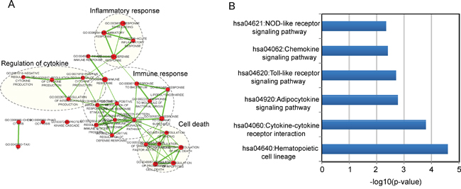 As an initial step to infer potential biological functions of the 9LncSigAMI, we first examined the expression correlation between mRNAs and nine lncRNAs using the Pearson correlation coefficient and identified 517 mRNAs positively correlated with at least one of the nine lncRNAs. Then GO and KEGG function enrichment analysis for mRNAs co-expressed with lncRNAs was conducted to identify associated biological processes and pathways of the 9LncSigAMI. Results with GO analysis revealed that mRNAs co-expressed with nine lncRNAs tended to be significantly enriched in 30 GO terms in the “Biological Process” (GOTERM-BP-FAT) (adjusted p-value < 0.10 and an enrichment score of >1.5) (Supplementary Table S2), which were grouped into four functional clusters including immune response, inflammatory response, regulation of cytokine and cell death (Figure 4A). The analysis of KEGG showed that mRNAs co-expressed with nine lncRNAs were involved in several pathways including Hematopoietic cell lineage, Cytokine-cytokine receptor interaction, Adipocytokine signaling pathway, Toll-like receptor signaling pathway, Chemokine signaling pathway and NOD-like receptor signaling pathway (Supplementary Table S3). These biological processes and pathways have been reported to be close with myocardial infarction [32–39], suggesting that the perturbation of nine lncRNAs in the 9LncSigAMI played important parts in the occurrence of AMI by interacting with mRNAs involved in known MI-related biological processes and pathways.
