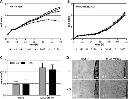 Figure 1: Cytotoxicity of ZA on breast cancer cells. (A+B) High concentrations of ZA affect viability of MCF-7 but not of MDA-MB231. MCF-7 (A) and MDA-MB231 (B) were treated with either 0 µM (circle), 1 µM (square), 3 µM (triangle) or 5 µM (inverse triangle) ZA. Cell proliferation was measured over 72 h using the xCELLigence system and is indicated as cell index. (C+D) Migration capacity of MCF-7 and MDA-MB231 is not affected by ZA. ECM-based migration assays for MCF-7 and MDA-MB231 over 48 h in the absence (gray bars, top pictures) and presence of 2 µM ZA (black bars, bottom pictures). Scale bars indicate 200 µm.
