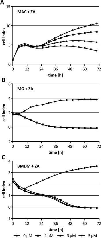 Figure 2: Cytotoxicity of ZA on macrophages. (A) Human macrophages (MAC), (B) microglia (MG) and (C) BMDM were treated with either 0 µM (circle), 1 µM (square), 3 µM (triangle) or 5 µM (inverse triangle) ZA. Cell proliferation/morphology was measured over 72 h using the xCELLigence system and is indicated as cell index. While viability of MAC is affected dose-dependently by ZA, viability of MG and BMDM is affected at the lowest concentration tested after 36 h and 48 h treatment, respectively.