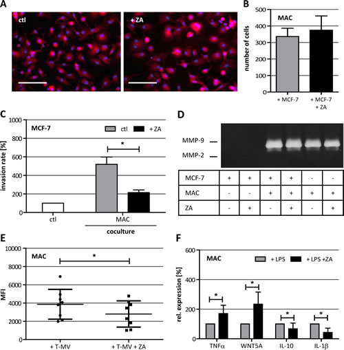 Figure 3: Characterization of ZA-treated human macrophages (MAC). (A) Phalloidin-TRITC staining of untreated MAC (left picture) and MAC treated with 1 µM ZA (right picture) showing the same cell morphology under both conditions. Scale bars indicate 100 µm. (B) Migration assay for MAC in coculture with MCF-7 in the absence (gray bar) and presence of 1 µM ZA (black bar) reveal no difference in the number of migrated cells (means ± SD, n = 8). (C) ZA decreases the MAC-induced invasiveness of MCF-7 cells shown by microinvasion assay of MCF-7 cells alone (white bar) and in coculture with MAC in the absence (gray bar) or presence of 1 µM ZA (black bar). Invasiveness is indicated as percentage of the control MCF-7 cells alone (means ± SD, n = 3, *P < 0.01). (D) Gelatine zymography of cell culture supernatants from MCF-7 cells alone, + ZA, + MAC, + MAC and ZA, MAC alone and MAC +ZA reveal no difference in the secretion of MMP-9 after ZA treatment. (E) ZA decreases T-MV uptake in MAC shown by FACS analysis. Cells were treated with 1 µM ZA (square) or diluent (circle) for 48 h before adding 5 µg PKH26-labeled T-MV for another 24 h. T-MV uptake is indicated as mean fluorescent intensity (MFI) of MAC (means ± SD, n = 7, *P < 0.05). (F) ZA alters LPS-induced expression of TNFα, WNT5A, IL-10 and IL-1β measured by qRT-PCR in MAC treated with 100 µg/ml LPS alone (gray bars) or 100 µg/ml LPS + 1 µM ZA (black bars). Relative expression levels are indicated as percentage of the condition MAC + 100 µg/ml LPS (means ± SD, n ≥ 4, *P ≤ 0.05).