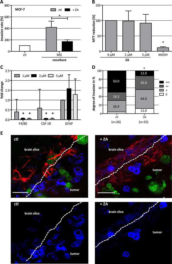 Figure 4: ZA decreases microglia (MG)-induced invasiveness of MCF-7 cells. (A) ZA decreases MG-induced invasiveness of MCF-7 cells shown by microinvasion assay of MCF-7 cells alone (white bar) and in coculture with MG in the absence (gray bar) or presence of 1 µM ZA (black bar). Invasiveness is indicated as percentage of the control MCF-7 cells alone (means ± SD, n = 3, *P < 0.05). (B) MTT assay of organotypic brain slices treated with ZA at the concentrations indicated or methanol (MeOH) reveal no toxic effects of ZA on the tissue. MTT reduction is given as percentage of untreated slices (means ± SD, n = 6, *P < 0.001). (C) ZA decreases the expression of F4/80 and Csf-1R but not Gfap in organotypic brain slices measured by qRT-PCR. Tissue was treated with 1 µM (gray bars), 2 µM (black bars) or 5 µM (black doted bars) ZA for 72 h. Relative expression levels are indicated as fold changes to the untreated control (means ± SD, n = 3, *P < 0.001). (D) ZA decreases MCF-7 cell invasion in organotypic whole-brain slice cocultures. Tumor cell invasion was quantified in the absence (left bar) and presence (right bar) of 2 µM ZA (n = number of slices; +++ = highliy invasive; ++ = moderately invasive; + = low invasive; 0 = non-invasive) (*P = 0.01). (E) Picture of organotypic brain slices cocultured with GFP-labeled MCF-7 cells (green) and stained with isolectin B4-674 (blue) and αGFAP-TRITC (red) in the absence (left) and presence (right) of 2 µM ZA. Scale bars indicate 50 µm.