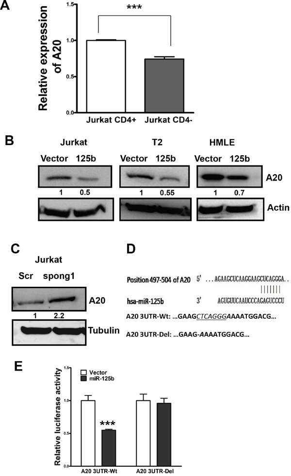Figure 2: A20 is a direct target of miR-125b in T cells. A. qRT-PCR was performed to examine the expression of A20 in CD4+population and CD4-pouplation of Jurkat cell lines. GAPDH was used as an internal control and for normalization of the data. Columns represent the mean of three independent experiments; bars represent SE. ***, p<0.001. B and C. Jurkat-vector, Jurkat-miR-125b, T2-vector, T2-miR-125b, HMLE-vector, HMLE-miR-125, Jurkat-scramble and Jurkat-miR-125b-spong1 stable cell lines were collected. Cell lysates were prepared for Western blotting with an antibody against A20 with β-actin used as a loading control. D. A20 3′ UTR contains a predicted miR-125b-binding site. Alignment between the miR-125b seed sequence and A20 3′ UTR is shown. A schematic diagram shows the wild type and mutant 3’UTR of A20. E. Jurkat cells were co-transfected with luciferase reporter plasmids with or without 3′-UTR of A20, pre-miR-125, or pre-miR-negative (Ctr). 48 hours post-transfection, cells were harvested and lysed with lysis buffer. Luciferase activity was measured by using a dual luciferase reporter assay. The pRL-TK vector was used as an internal control. The results were presented as relative luciferase activity (firefly LUC/Renilla LUC).
