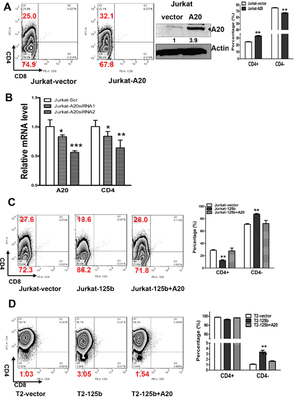 Since A20 is a direct target of miR-125b and overexpression of miR-125b inhibits T cell differentiation, we next examined whether miR-125b regulates T cells differentiation through targeting A20. We first explored whether overexpression of A20 induces the differentiation of T cells. We forced overexpression of A20 into Jurkat cells. Compared to cells transfected with control vector, A20 overexpressing cells have an increased population of CD4+ cells (Figure 3A). To further confirm this result, we knocked down the expression of A20 in Jurkat cells by two different siRNAs. Depletion of A20 decreased the expression of CD4 in a dosage-dependent manner (Figure 3B). To test whether miR-125b regulates the expression CD4 through A20, we restored the expression of A20 in miR-125b overexpressing cells (Jurkat-miR-125b and T2-miR-125b) with an A20 expressing vector pMSCV-A20 (Figure 3C and 3D, Supplementary Figure 2). Restoration of A20 in miR-125b overexpressing cells dramatically decreased CD4- cells to the basal percentage of CD4- cell population in the control cells (Jurkat-vector and T2 vector cells). These results support that miR-125b regulates T cell differentiation through targeting A20.
