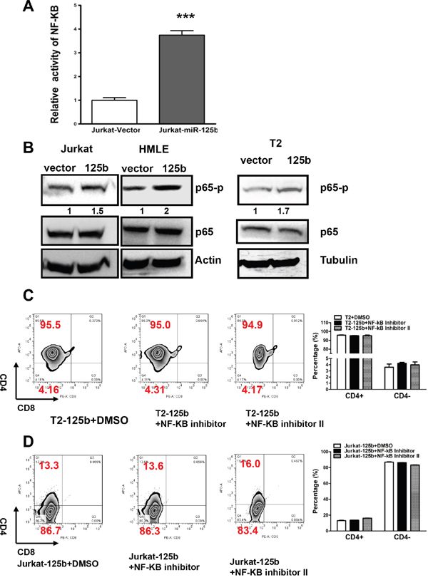 Figure 4: miR-125b inhibition of the differentiation of T cells is NF-kB independent. A. Jurkat-vector and Jurkat-miR-125b cells were transfected with NF-κB reporter by using Lipofectamine 2000 reagent. 48 hours post-transfection, cells were harvested and lysed with passive lysis buffer. Luciferase activity was measured by using a dual luciferase reporter assay. The pRL-TK vector was used as an internal control. The results were expressed as relative luciferase activity (firefly LUC/Renilla LUC). B. Jurkat-vector, Jurkat-A20, T2-vector, T2 –miR-125b, HMLE-vector and HMLE-miR-125b stable cell lines were collected. Cell lysates were prepared for Western blotting with antibodies against p65 and p65-p. β-actin was used as a loading control. C and D. Jurkat-miR-125b and T2-miR-125b cells were treated with DMSO (control) and NF-κB inhibitors (Calbiochem) for 48 hrs. Cells were incubated with CD4 and CD8 antibodies for 45 min, washed, and then the cells were analyzed by flow cytometry.