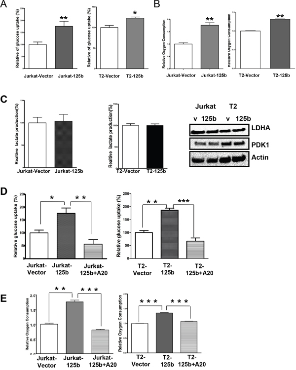 It has been known that glucose metabolism regulates T cell differentiation [22]. Since T cell differentiation is regulated by miR-125b, we surmised that miR-125b may also regulate glucose metabolism in T cell leukemia. To examine whether the overexpression of miR-125b alters glucose metabolism in human T cells, glucose uptake, oxygen consumption and lactate production, which are hallmarks of glycolysis, were measured and compared in vector and miR-125b-overexpressing cells. Both Jurkat-miR-125b and T2-miR-125b cells showed a significantly higher glucose uptake (Figure 5A) and oxygen consumption (Figure 5B) compared to Jurkat-vector and T2-vector, respectively. However, there was no change of lactate production in these two pairs (Figure 5C). To further confirm the lactate production, we examined the LDHA protein expression level in miR-125b overexpressing and control cells by immunoblotting. The result showed there was also no change of LDHA expression level between vector cells and miR-125b overexpressing cells (Figure 5C). Since miR-125b regulates T cell differentiation through A20, we deduced that miR-125b may also regulate glucose metabolism through A20. To test the hypothesis, we first explored whether A20 alters glucose metabolism in human T cells, we knocked down A20 in Jurkat cells with siRNA, and measured glucose uptake. Knockdown of A20 in Jurkat cells increased glucose uptake in comparison with scrambled siRNA (Supplementary Figure 4). We restored the expression of A20 in miR-125b overexpressing cells with pMSCV-A20 and examined the glucose uptake and oxygen consumption. Restoration of A20 in miR-125b overexpressing cells dramatically decreased oxygen consumption and glucose uptakes to the level of cells transfected with empty vector (Figure 5D and 5E). These results indicate that A20 is a critical mediator of miR-125b function in enhancing glucose uptake and oxygen consumption.