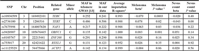 Table 1: Results for each telomere length-related SNP, including their associations with melanoma risk and nevus count