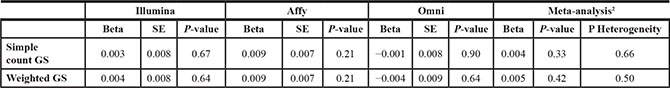 2 Analyses were first conducted within each of the platform-specific genetic datasets. We used fixed-effect meta-analysis to obtain a combined estimate.