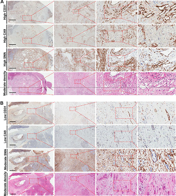 Figure 1: Examples of (A) high CD31 and CA9 expression and (B) low CD31 and CA9 expression in patients with pancreatic cancer adenocarcinoma. The corresponding haematoxyllin-eosin (stroma density) and αSMA (stroma activation) images are shown as well. The left panels illustrate large pancreatectomy sections (Bar: 6 mm). The magnifications of the second, third and fourth inserts from the left are × 50, × 200 and × 400, respectively.
