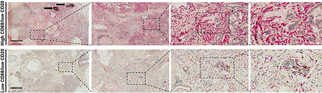 Figure 2: Examples of (A) high CD68 expression and (B) low CD68 expression in patients with pancreatic cancer adenocarcinoma. The corresponding CD20 images are shown as well. The left panels illustrate large pancreatectomy sections (Bar: 6 mm). Black arrows indicate two lymph node metastases. The magnifications of the second, third and fourth inserts from the left are × 50, × 200 and × 400, respectively.