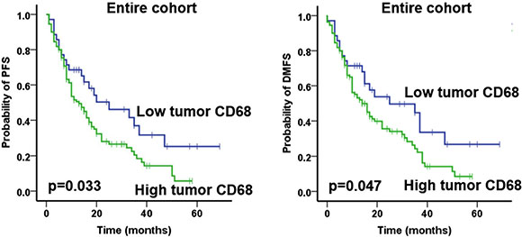 We would like to acknowledge the limitations of our work. First, although patients were treated and followed up prospectively, the retrospective nature cannot exclude potential selection bias. Second, the median follow-up in our study is relatively short. Also, CD68 is a pan-macrophage marker, which does not provide any information with regard to the polarization status of macrophages, such as CD163 that is specific for M2-macrophages. Furthermore, the lack of automated confirmation of CD68 and CD20 constitutes another limitation. Finally, our observations warrant validation in prospective cohorts, preferably in large pancreatectomy sections.