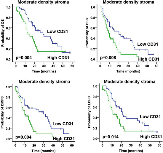 Macrophages have been classified into two groups depending on their functional status, that is classically activated (M1) and alternatively activated (M2) macrophages. In malignancies, tumor associated macrophages (TAMs) have been traditionally considered to belong to the polarized M2 phenotype and can be identified using varies markers, such as CD163, CD23, IL-10, CXCR2 and others [40] M2-type TAMs decrease response to chemotherapy and radiotherapy, impair T cell infiltration and function, and promote immune evasion and tumor progression [40, 41]. Previous groups have investigated the prognostic impact of macrophages and reported an adverse impact on outcome [42, 43] but their association with the desmoplastic stroma in human samples remains unexplored. We failed to detect a significant clinical role for total CD68 expression. Instead, high tumor compartment CD68 expression predicted for worse outcome in the entire cohort, similar to stromal compartment CD68 infiltration in loose density tumors. Thus, immune markers should be examined in the context of tumor compartment and desmoplastic stroma, as analysis of their total expression in isolation can “mask” their prognostic impact in patient subgroups. These data are also important with the progressively increased testing of agents targeting macrophages, such as colony-stimulating factor 1 (CSF1) inhibitors [44] in the clinical setting.