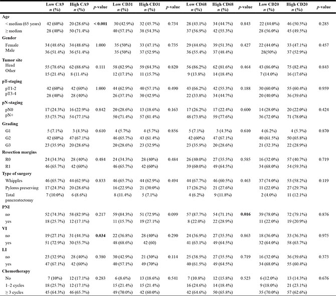 With regard to the correlation of CA9, CD31, total CD68 and total CD20 expression with the clinicopathological parameters (Table 2), patients younger than 65 years of age (median cut-off) had significantly lower percentages of tumor hypoxia and vice versa (low CA9 vs high: p < 0.001). Unexpectedly, significantly more patients with vascular invasion (VI) had lower CA9 expression (p = 0.034). Also, PNI was more common in patients with high CD68 expression (p = 0.016). We failed to detect any further significant correlation between either CA9, CD31, CD68, CD20 and the clinicopathological characteristics (Table 2).
