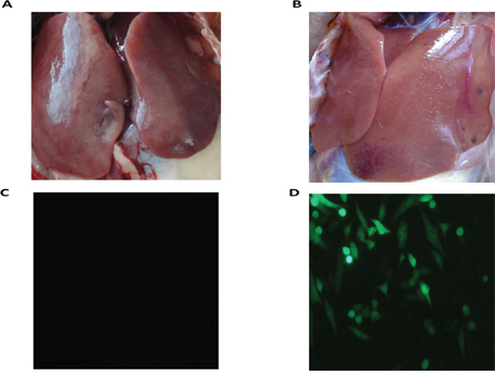 Figure 1: RNA-Seq sample. A. Liver of resistant chicken; B. liver of susceptible chicken; C. determination of ALV-J infection of resistant chicken by IFA after inoculating liver homogenate into DF-1 cells; D. determination of ALV-J infection of susceptible chicken by IFA after inoculating liver homogenate into the DF-1 cells.