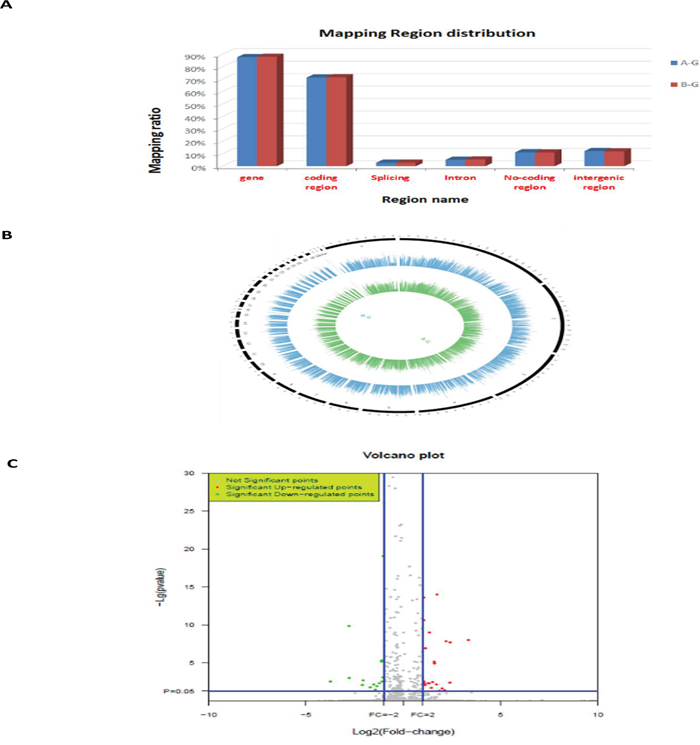 Figure 2: RNA-Seq data. A. Mapping regions distribution within read alignments; B. genome coverage distribution of 1kh windows (outline is the reference genome, inside is the chromosome coverage across all samples); C. distribution of differentially expressed genes in ALV-J resistant (compared to susceptible) chickens. A-G: susceptible chickens; B-G: resistant chickens.
