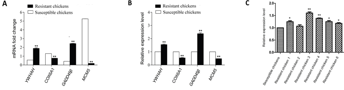 Figure 4: Validation of four differentially expressed genes identified by RNA-Seq with qPCR and identification of GADD45β expression in randomly selected chickens by qPCR. A. mRNA fold-changes; B. relative expression levels; C. relative expression of GADD45β in randomly selected chickens. Data shown are the means ± SE, * P < 0.05 and ** P < 0.01.