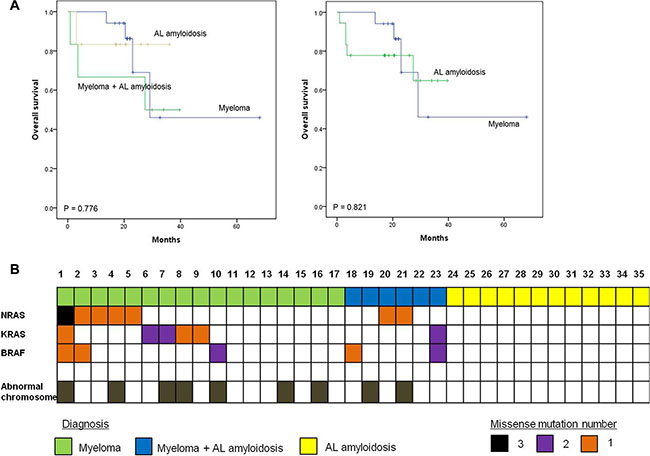 Figure 1: Survival plots for multiple myeloma patients with or without amyloidosis. (A) Survival outcome of patients in different groups (B) NRAS, KRAS, and BRAF (MAPK pathway) mutation profile in multiple myeloma and AL amyloidosis patients