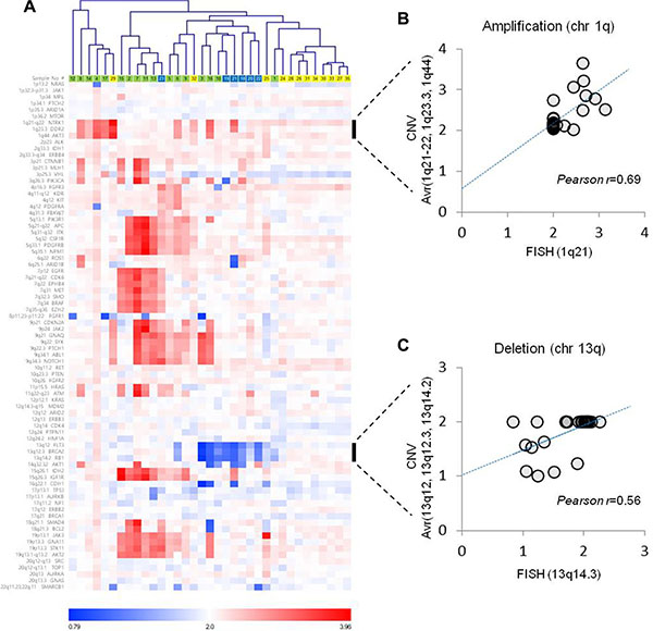 Figure 3: Copy number variations estimated from gene panel sequencing. (A) Pearson’s correlation distances were used for the average-linkage hierarchical clustering of patients. Correlation analysis between the CNV estimation and FISH analysis for (B) chromosome 1q amplification and (C) chromosome 13q deletion.