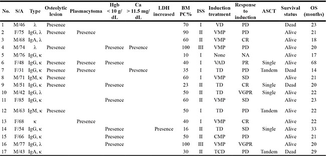 S: sex; A: age; Hgb: hemoglobin; LDH: lactate dehydrogenase; BM: bone marrow; PC: plasma cell; DSS: Durie-Salmon stage; ISS: International staging system; ASCT: autologous stem cell transplantation; OS: overall survival; GI tract: gastrointestinal tract; TCD: thalidomide, cyclophosphamide, dexamethasone; MD: melphalan, dexamethasone; TD: thalidomide, dexamethasone; VMP: bortezomib, melphalan, prednisone; CR: complete response; PR: partial response; SD: stable disease; PD: progressive disease; NA: not applicable; MM: multiple myeloma.