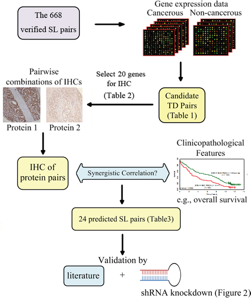 Figure 1: A graphical schematics of our approach. Microarray gene expression of 83 paired cancerous and non-cancerous tissues was used to sift tumor dependent gene pairs of lung adenocarcinoma from 668 collected synthetic lethal (SL) pairs, which resulted in 20 genes for immunohistochemistry (IHC). Combining the 23 IHC into pairs and correlating them to the each of five clinical factors yielded 24 predicted SL pairs. Finally, we validated the predicted SL pairs by the literature and shRNA knockdown.