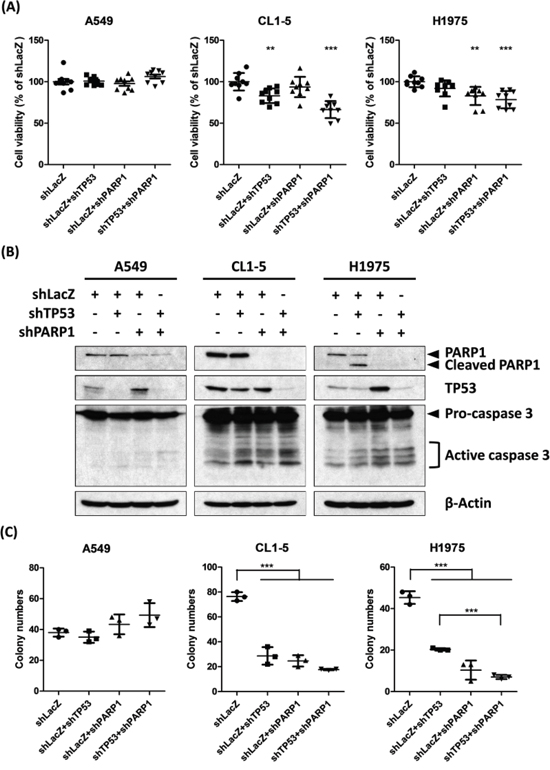The cells infected with shLentivirus were harvested for mRNA extraction with TRIzol reagent (Thermo Fisher Scientific), and then the reverse transcription was performed. The cDNA was used to perform polymerase chain reaction. The primers used to confirm TP53 mRNA level were 5’-ACCTATGGAAACTACTTCCTGAAA-3’ and 5’-ACCATCGCTATCTGAGCAGC-3’. The primers used to confirm PARP1 mRNA level were 5’-AGCGTGTTTCTAGGTCGTGG-3’ and 5’-CCCCTTGCACGTACTTCTGT-3’.