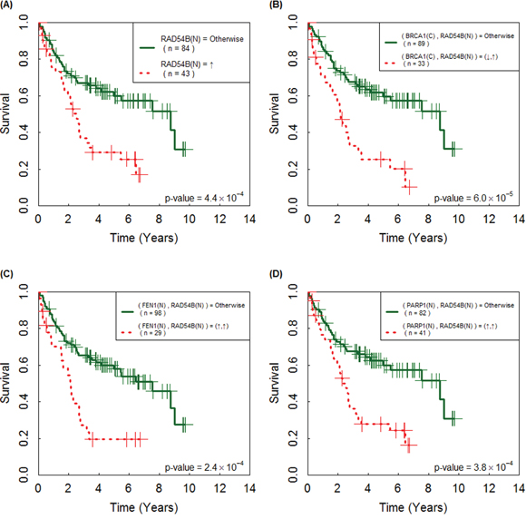 IHC of RAD54B↑, BRCA1↓-RAD54B↑, FEN1(N)↑-RAD54B↑and PARP1↑-RAD54B↑were shown to be prognostic markers, independent of age and stage, for 131 Asian LADC patients. Importantly, these markers were confirmed by three independent gene expression data sets from diverse geographic regions and ethnicities (a total of 426 LADC patients), a Japanese cohort (GSE13213, n = 117), HLM of GSE68465 and TCGA (n = 230, ~99% non-Asian subjects).