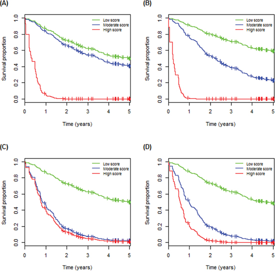 Figure 5: Estimated survival curves for the predictive markers on the TCGA (test) set. A. POLB-TP53. B. POLB-TP53 with age and stage. C. POLB. D. POLB with age and stage.