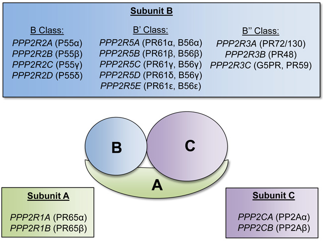 Figure 2: Protein phosphatase 2A subunits and respective encoding genes. Schematic of the serine-threonine protein phosphatase (PP2A) complex. The PP2A complex is composed of three subunits: A, B, and C. Each respective subunit is encoded by the listed genes. The A and C subunits form a catalytic core, and the B subunit is involved in determining substrate specificity.