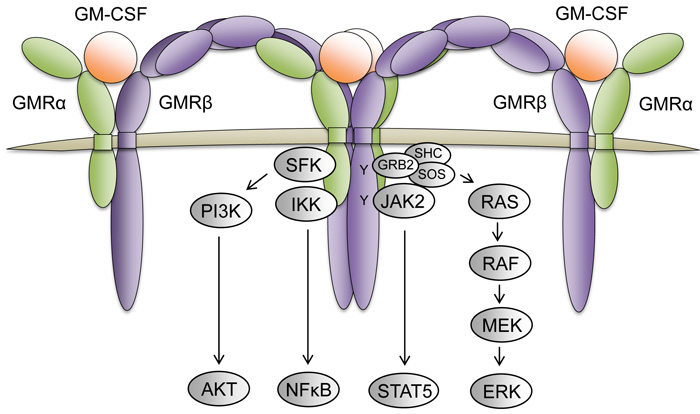 Figure 5: The GM-CSF receptor complex and its downstream signaling pathways. The GM-CSF receptor is a dodecamer complex composed of 4 GMRα receptor subunits (green), 4 GMRβ receptor subunits (purple), and 4 GM-CSF molecules (orange). Upon GM-CSF ligand binding and receptor oligomerization, the juxtaposed GMRβ subunits bound to JAK2 promotes receptor transphosphorylation to initiate activation of various signaling pathways (grey) that regulate cellular proliferation, survival, and differentiation.