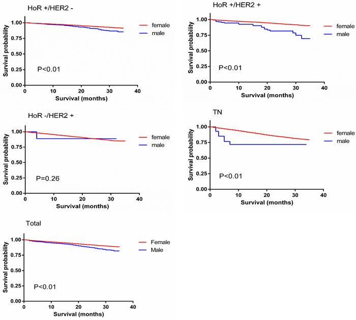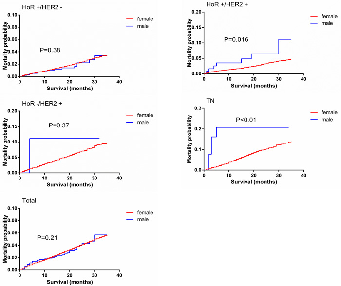 Although the mortality and survival rates have been significantly improved for both MBC and FBC patients, more progress has been made in FBC than MBC [6, 7]. Because of the rarity of MBC, no randomized trials have been possible, and most information is derived from retrospective studies. Several studies have compared MBC and FBC and have found that MBC was not only associated with a worse prognosis but also showed more advanced stages and older ages at diagnosis, inappropriate staging, increased comorbidities, and more aggressive tumor biology [8-10]. Other studies have shown no association between MBC and survival and have suggested that patient sex does not influence mortality [11-13]. Thus, there is no consensus on the relationship between sex and prognosis in BC. Given that treatment strategy and patient management depend on prognostic variables, we used data from the National Cancer Institute’s Surveillance, Epidemiology, and End Results (SEER) program to analyze the association of each tumor subtype with overall survival (OS) and breast cancer-specific mortality (BCSM) at diagnosis for males and females diagnosed with BC.