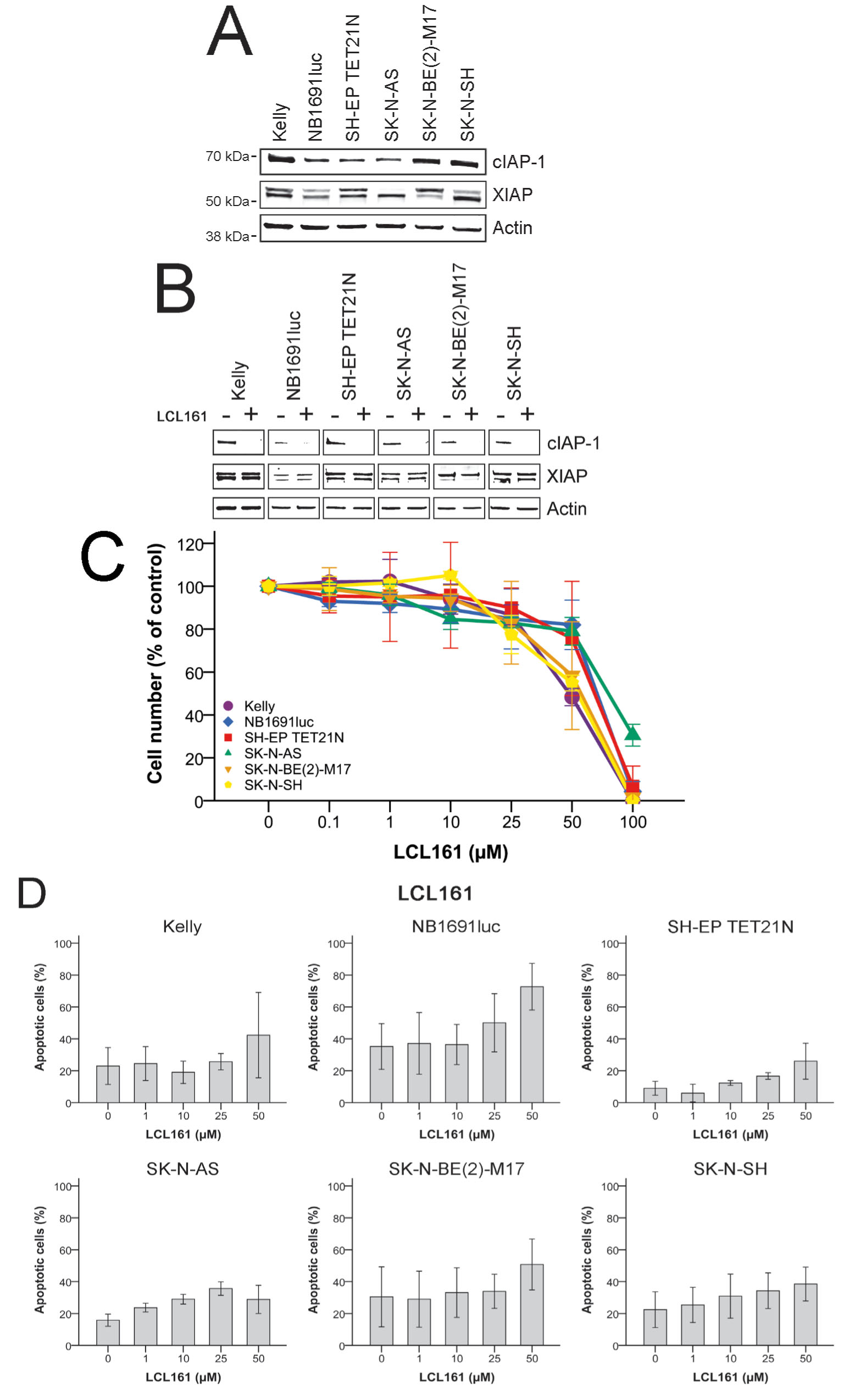 Figure 1: Effect of LCL161 on expression of cIAP-1 and XIAP, cell proliferation and induction of apoptosis in neuroblastoma cell lines. Expression of cIAP-1, XIAP and actin was detected by Western Blot analysis in untreated neuroblastoma cell lines A. and cells treated 30 min with 10 µM LCL161 B.. Proliferation of cells treated with the indicated concentrations of LCL161 was determined after 48 h C.. Proliferation of untreated cells was defined as 100 %. The proportion of apoptotic cells was determined by flow cytometry (Annexin V and PI staining) 48 h after LCL161 treatment D.. Values represent the mean ± SD of three independent experiments.