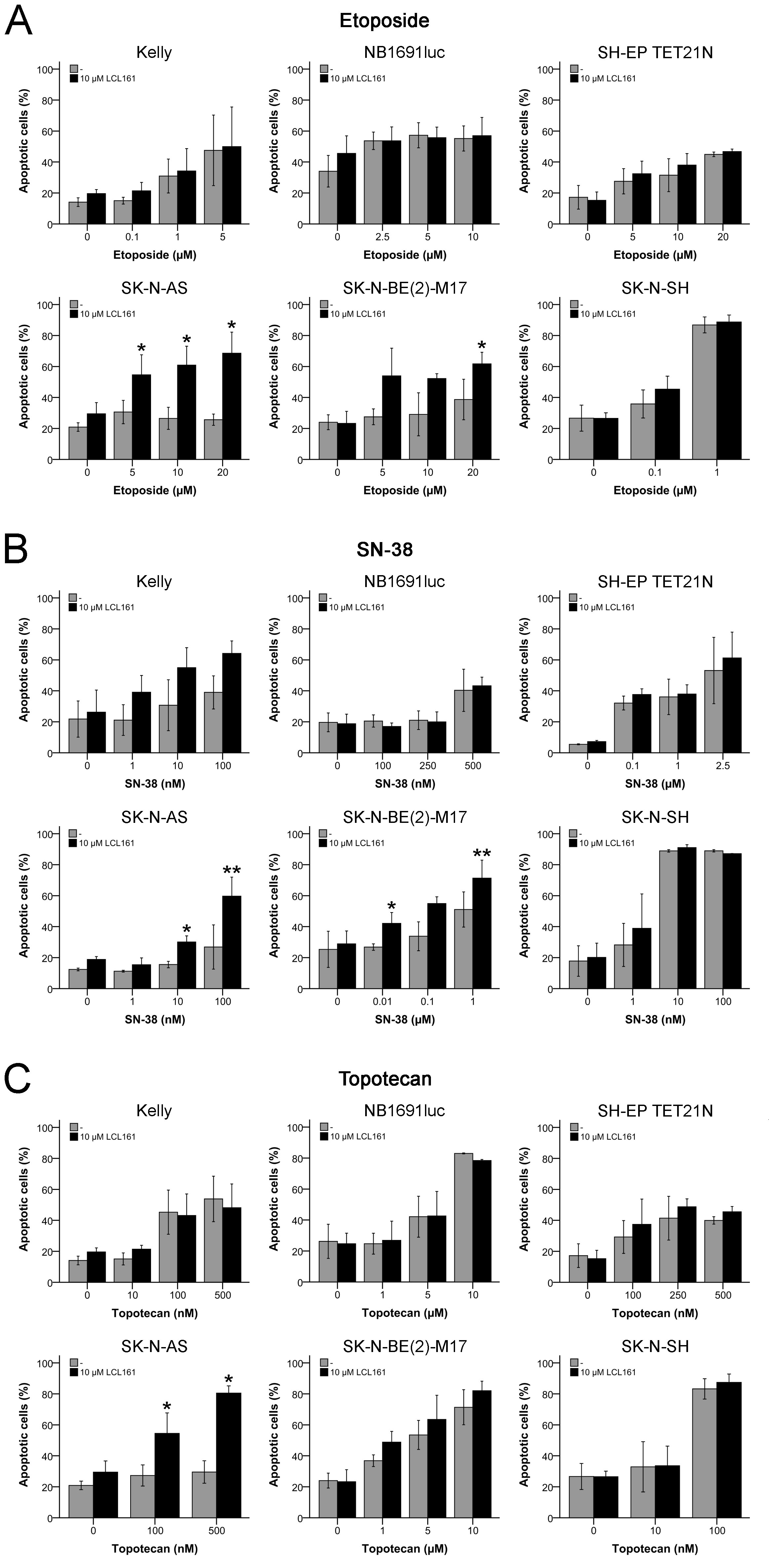 Figure 7: Induction of apoptosis in neuroblastoma cell lines by topoisomerase inhibitors and their combination with LCL161. Cells were treated with the indicated concentrations of LCL161, etoposide A., SN-38 B. or topotecan C. and the proportion of apoptotic cells was determined by flow cytometry (Annexin V and PI staining) after 48 h. Values represent the mean ± SD of three independent experiments, *; p ≤ 0.05, **; p ≤ 0.01.