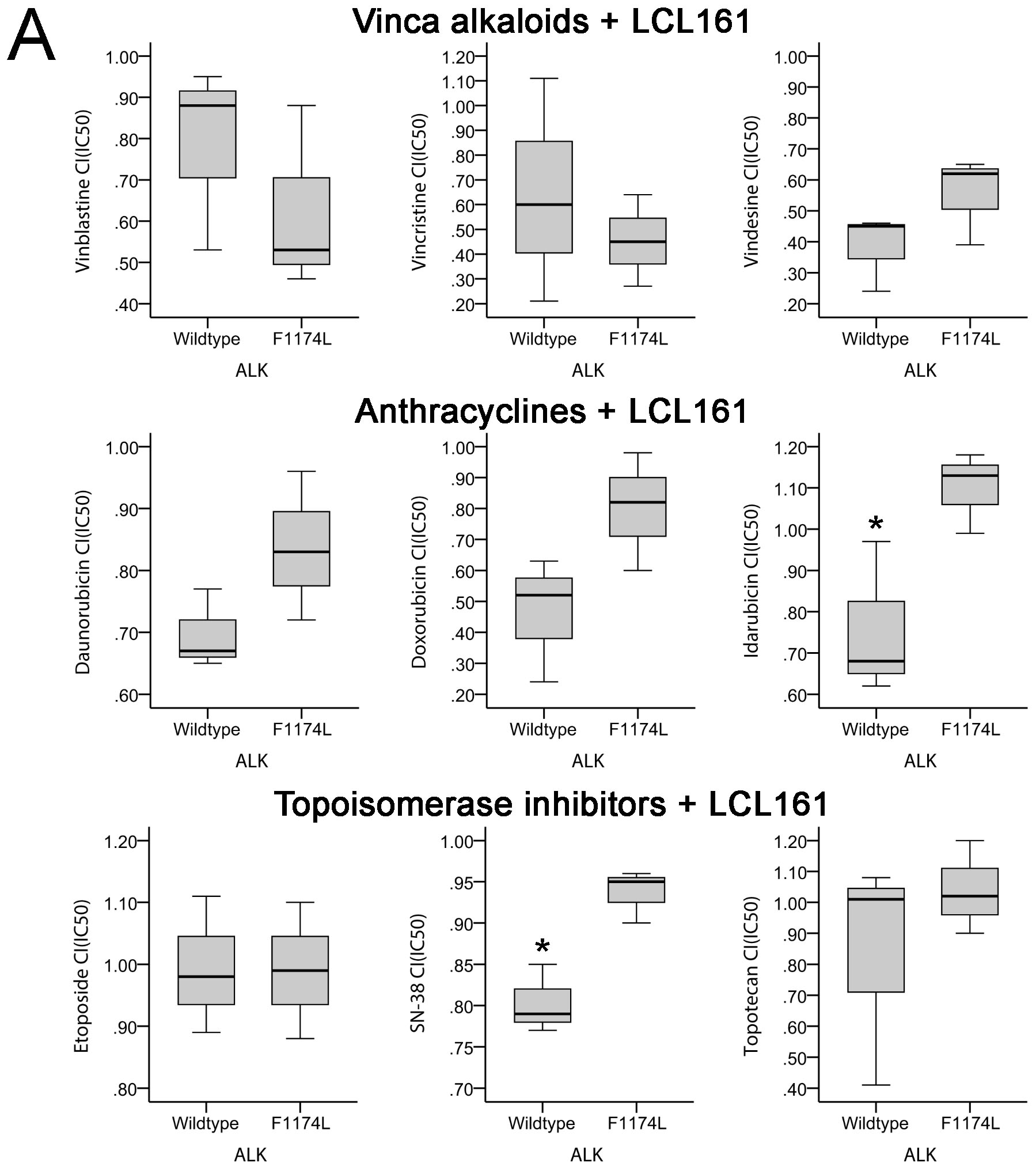 Using the Mann-Whitney U test it became evident that status of MYCN, deletion of chromosome arm 1p or mutated p53 could not account for significant differences between groups (data not shown). In contrast, in cell lines with activating mutation of ALK (ALKF1174L) a significantly higher CI than in ALKwt cells was observed for LCL161 and its combination with idarubicin (CI(IC50) 1.1 vs. 0.76, p = 0.05) or SN-38 (CI(IC50) 0.94 vs. 0.8, p = 0.05) (Figure 8A). The largest CI difference (ALKF1174L vs. ALKwt) was detectable for doxorubicin and LCL161 (CI(IC50) 0.8 vs. 0.46, p = 0.127).