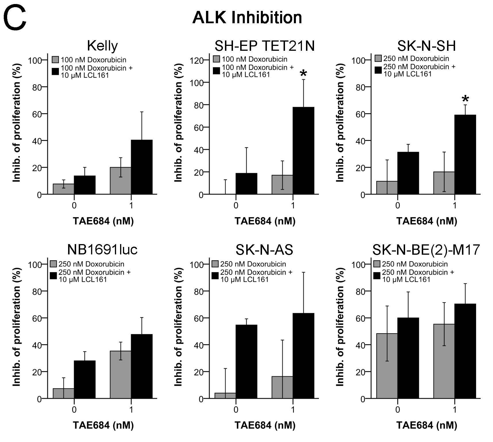 In contrast, in ALKwt cells the effects of LCL161 and doxorubicin were not significantly increased by TAE684.