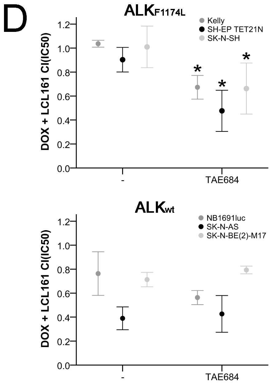 Simultaneous inhibition of ALK with TAE684 in doxorubicin and LCL161-treated cells had a relevant effect only in ALKF1174L cells (Figure 8C and Table S1A). In all three ALKF1174L cell lines TAE684 caused a strong increase in inhibition of proliferation leading to a significant decrease of the CI(IC50) to the synergistic range (Figure 8D and Table S1B). In contrast, TAE684 only marginally influenced the impact of doxorubicin and LCL161 in cells with ALKwt and thus no relevant changes of the CI(IC50) were observed (Figures 8C+8D and Tables S1A+S1B).