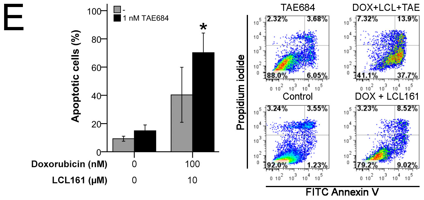 ALKF1174L SH-EP TET21N cells were most susceptible for TAE684-treatment and were therefore analyzed for apoptosis induction. Treatment with 1 nM TAE684 had only marginal effects on apoptosis. In contrast, the effect of combined doxorubicin and LCL161 was significantly reinforced by TAE684. This was reflected by an increase of early (Annexin V positive) and late apoptotic (Annexin V and propidium iodide positive) cells (Figure 8E).