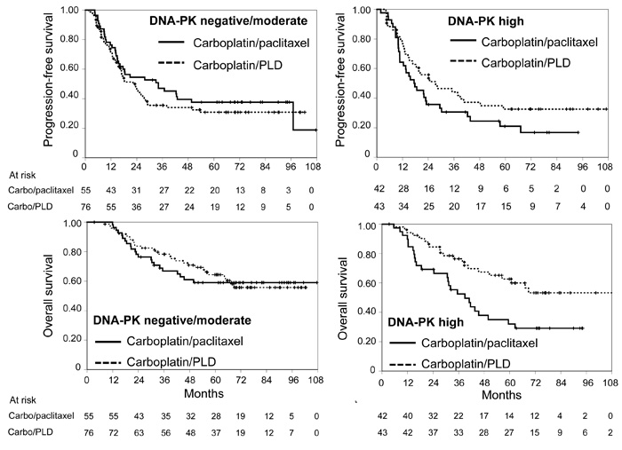 Figure 2: Kaplan-Meier estimated curves of progression-free survival (top) and overall survival (bottom) according to DNA-PK status (negative/moderate: graphs on the left, high: graphs on the right). Solid line: carboplatin/paclitaxel; dashed line: carboplatin/PLD. Vertical lines represent censoring.
