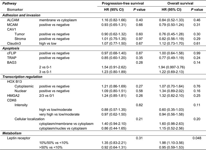 No biomarker had statistically significant (predefined significance level of 0.01) prognostic value for PFS and OS at multivariable analyses (Table 1).
